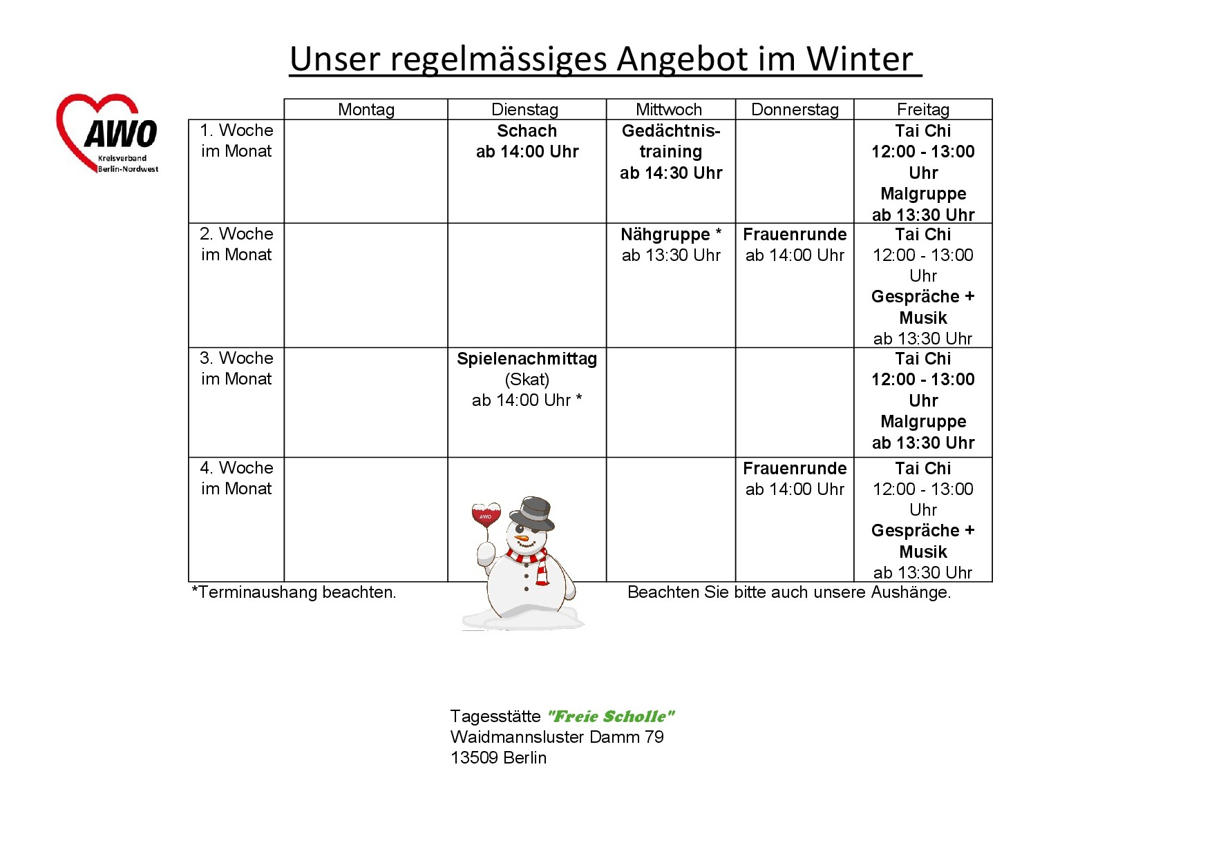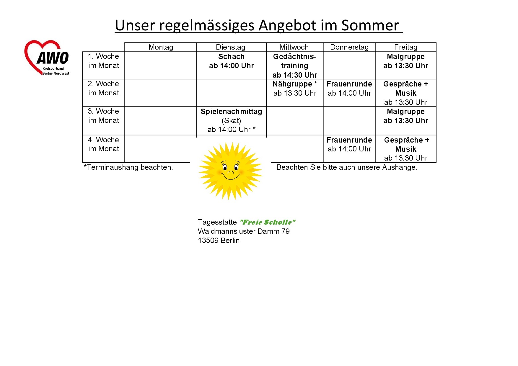 Melden Sie Ihren Terminwunsch an den Kreisverband der AWO Berlin-Nordwest. Nutzen Sie das Anfrageformular unter den regelmäßigen Angeboten.